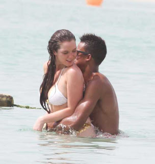 With the crystal clear blue waters up to their waists the pair shared a kiss and cuddle as Swansea footballer Scott wrapped his arms around his girlfriend.