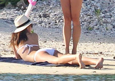 Her tiny bikini top exposed the painful-looking raw skin, which appeared to be close to where her long layered necklaces were placed in the previous shot's outfit.